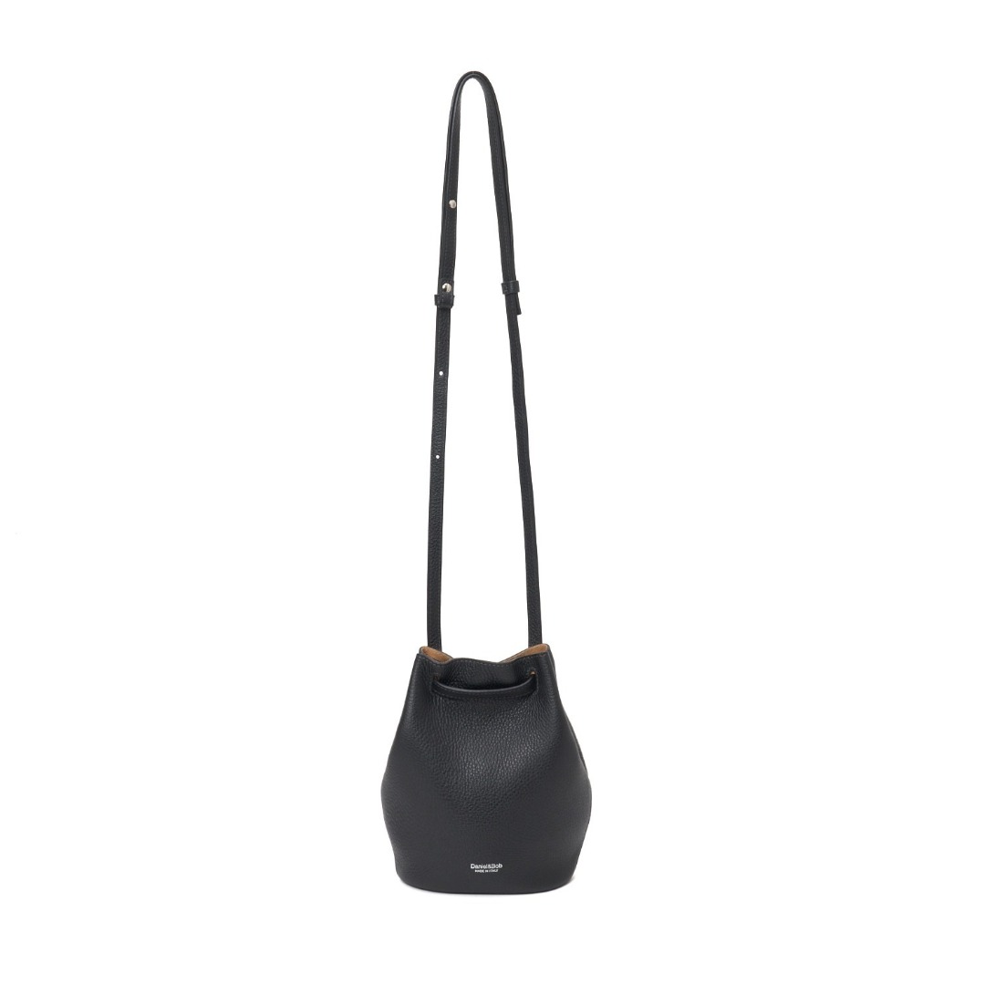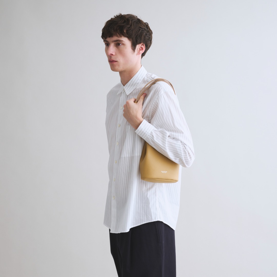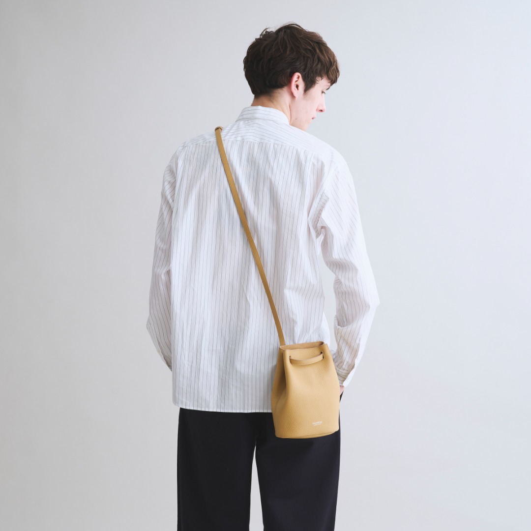 底面を正円から楕円にすることでマチを薄くし、スリムなシルエットに変更。大人のスマートさが際立ちました。巾着タイプ特有の手首に巻き付けるようにして気軽に持つことはもちろん、ホーボーバッグ感覚の肩掛けとしても持つことが可能。ストラップは自在に動かすことができるので、片側に伸ばしてクロスボディバッグとしてもお使いいただける2WAY仕様です。