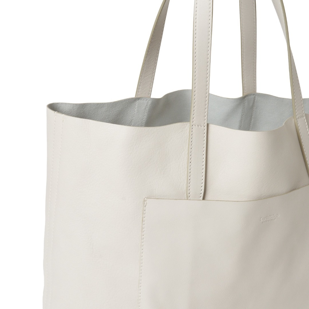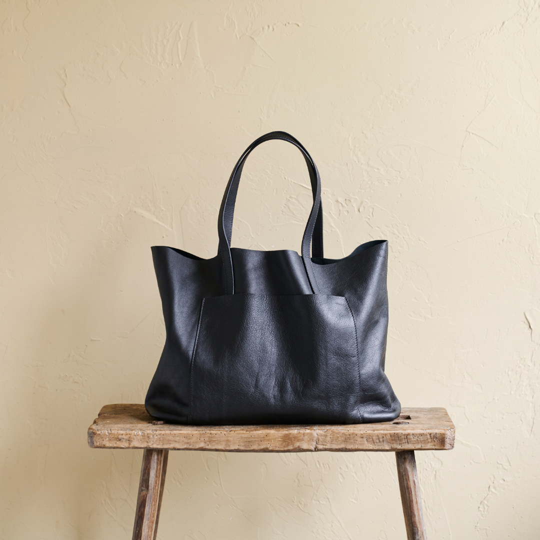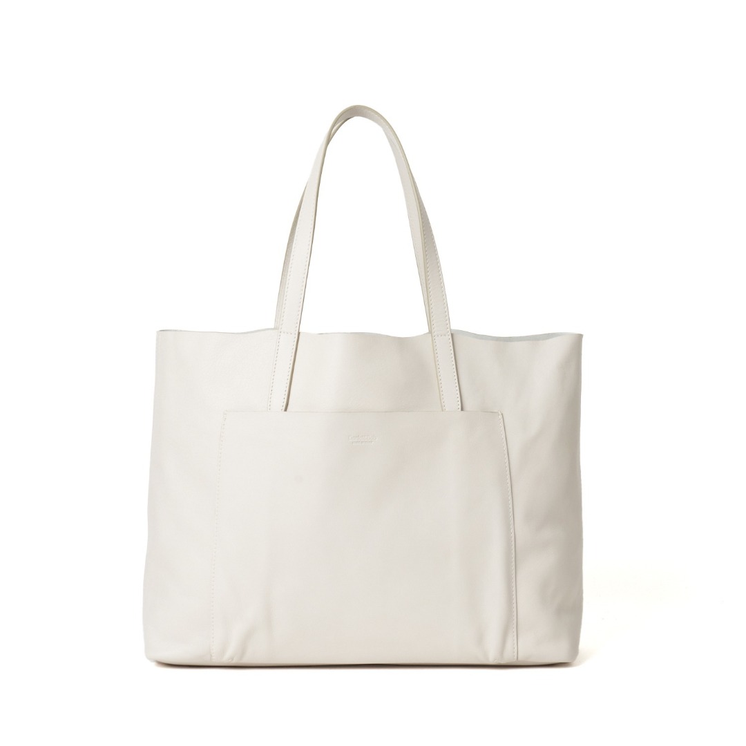 幅42cmの大容量トートバッグ。それでも重たい印象にならないのは、程よく柔らかく、細やかに刻んだシボが織りなす上質感ゆえでしょう。