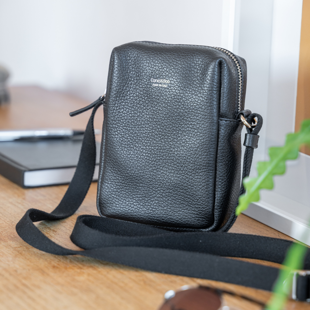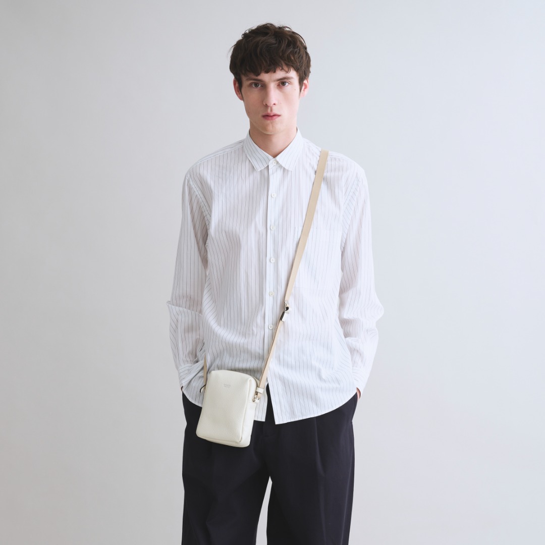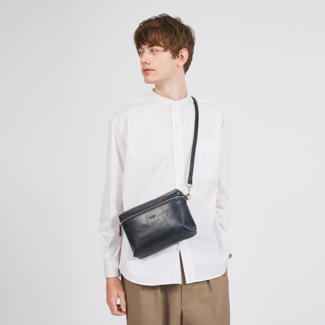 シンプルなスクエアシルエットのミニクロスボディバッグ。スタイリッシュな縦型フォルムに細めのショルダーストラップを採用しているので、スマートな大人の休日スタイルが叶います。ファスナーを用いた一室構造のシンプルな仕立て、マチも程よく、中に入れたものが見やすく取り出しやすい設計もポイント。上質なシボ革とキャンバスのストラップのコンビネーションが軽快でリュクスな印象です。