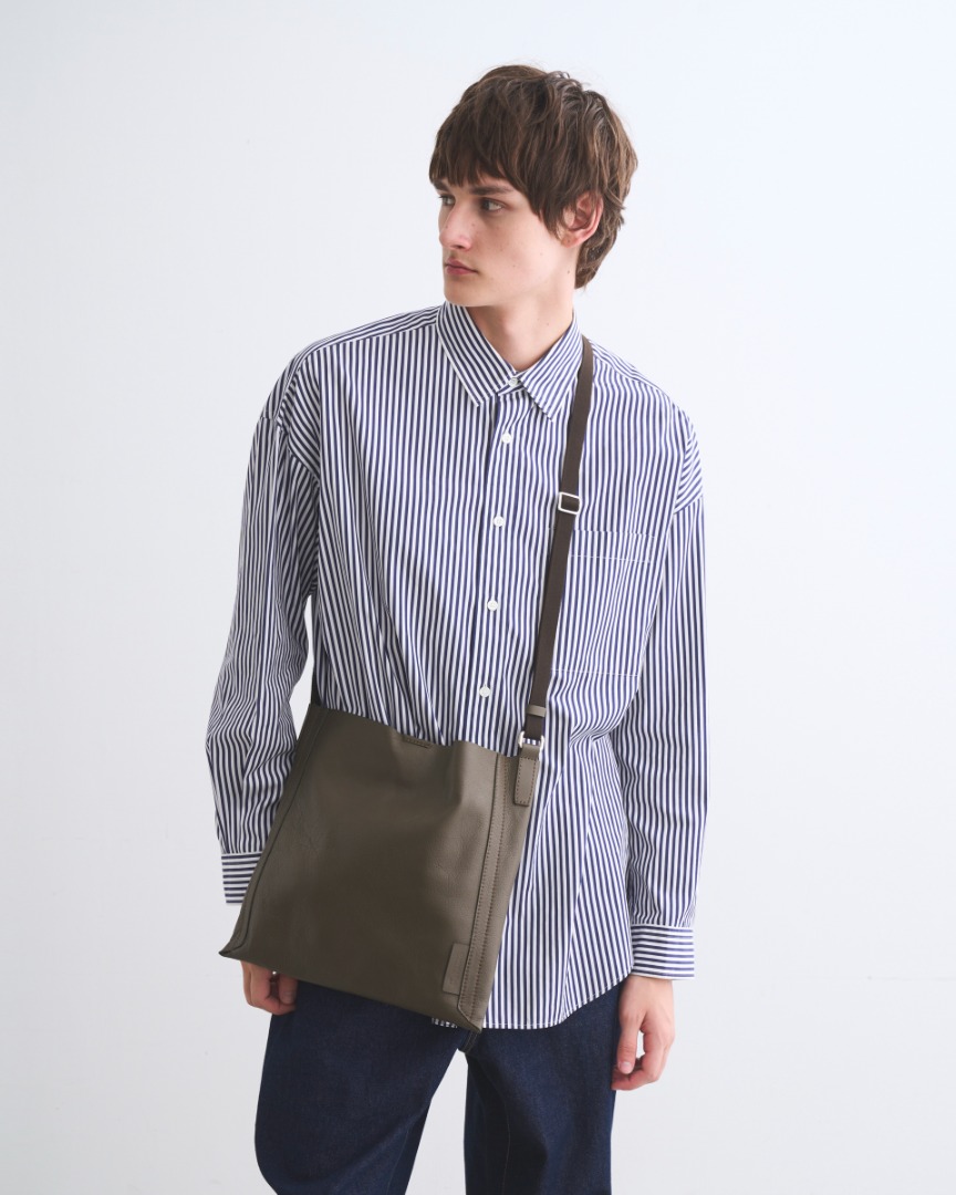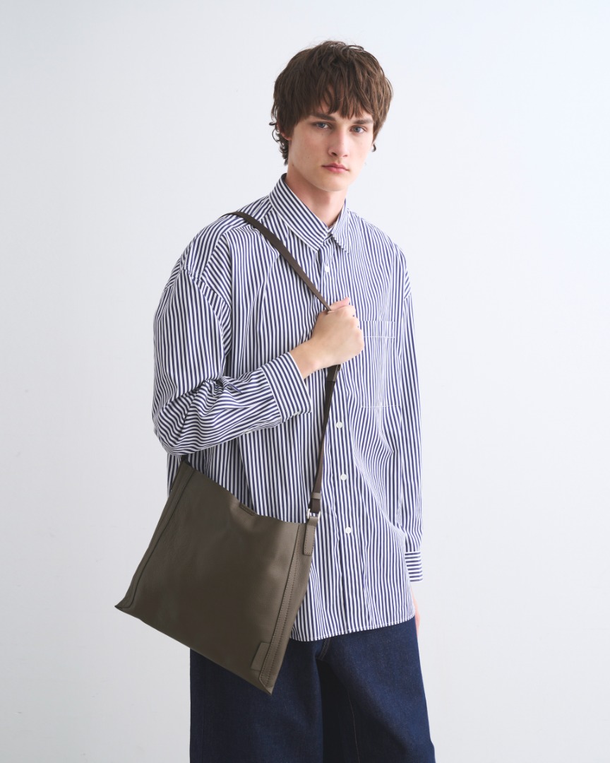 薄マチのスクエア型ショルダーバッグを軽量なレザーで仕立てる、実にシンプルなのですが、上品なスポーティスタイルが叶う一品に仕上がりました。一室構造であえてポケットなどのファンクションを排し、ミニマムに徹することで、上質なスムースレザーの魅力が際立ちます。