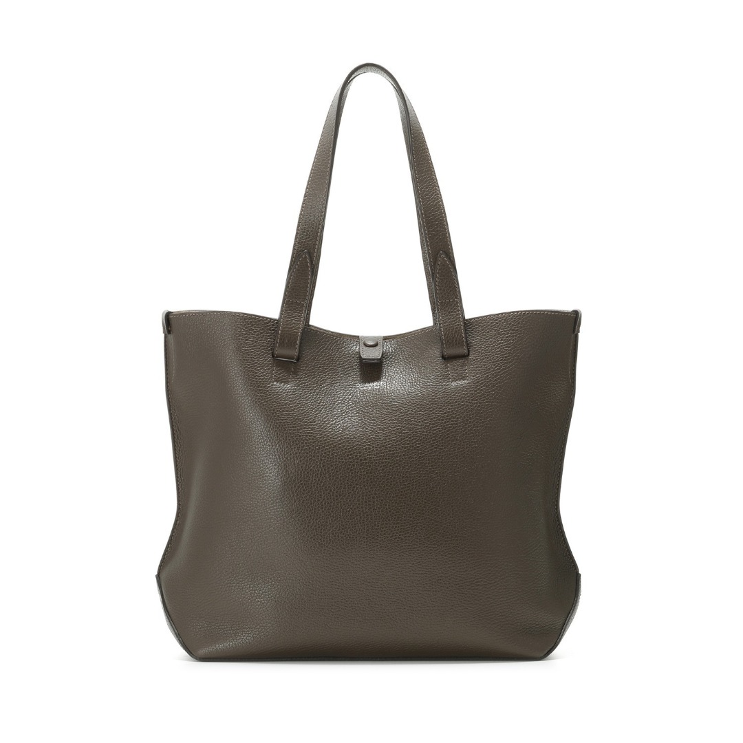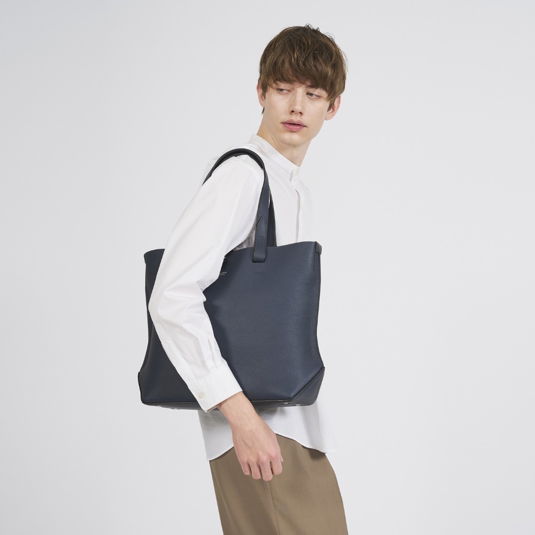 こちらもシボ革に薄いスウェードを貼り合わせた「アルチェアコピアート」で仕立てたトートバッグです。素材のソフトな印象に反して、ハンドルの合わせ部分とバッグ両端に切れ上がったトライアングルモチーフを差し込むことで、凛としたスタイリッシュさが引き立つデザインに仕上がりました。A4サイズの資料やPCなどが余裕で入る大容量ながら、すっきりとしたデザインなのでビジネスシーンで大活躍してくれます。